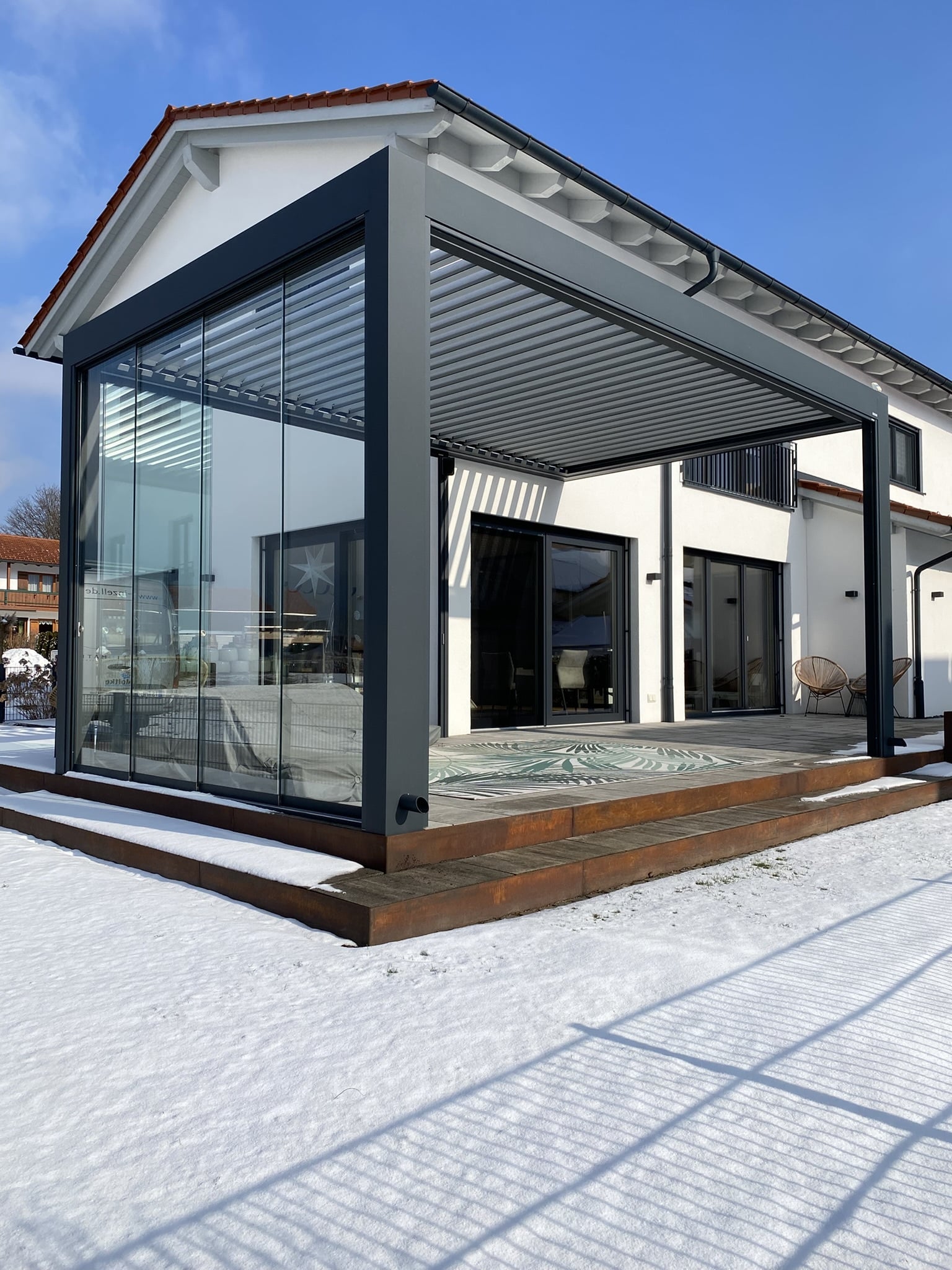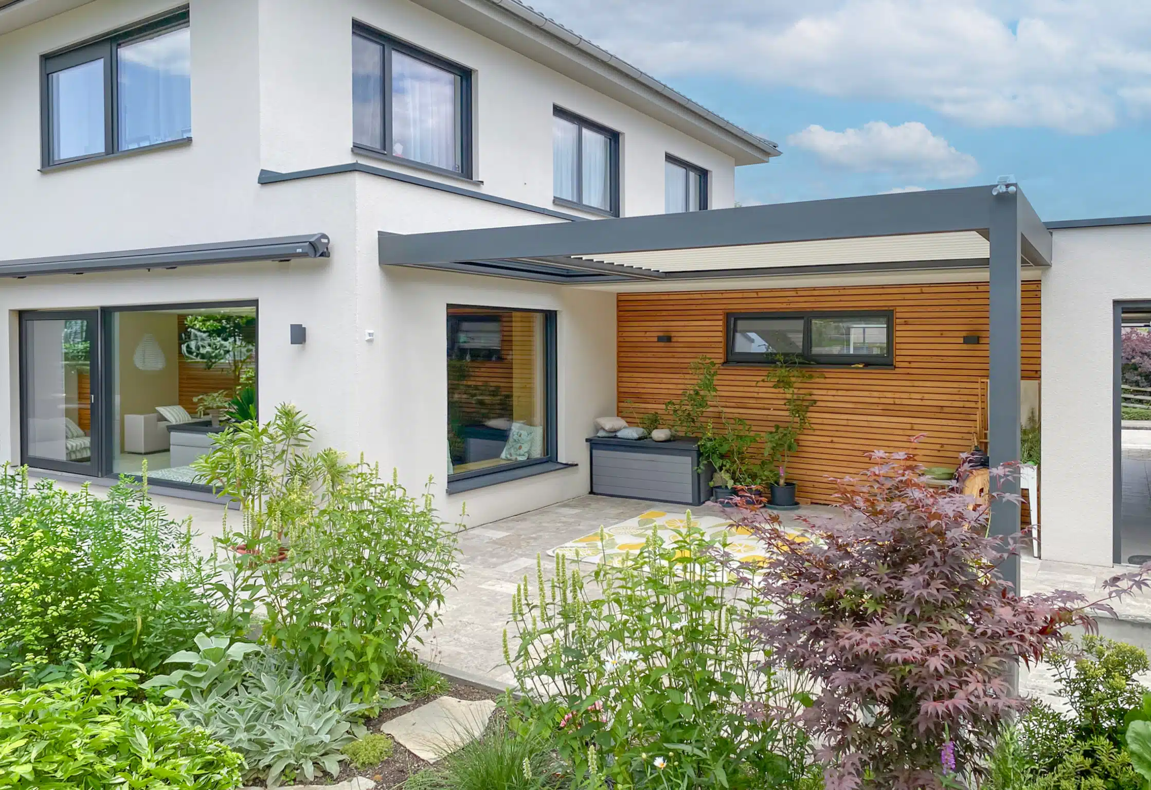 Besonders im Bereich der Terrassenüberdachungen entstehen geschützte Außenräume, die das Leben im Freien nahezu das ganze Jahr über ermöglichen.
