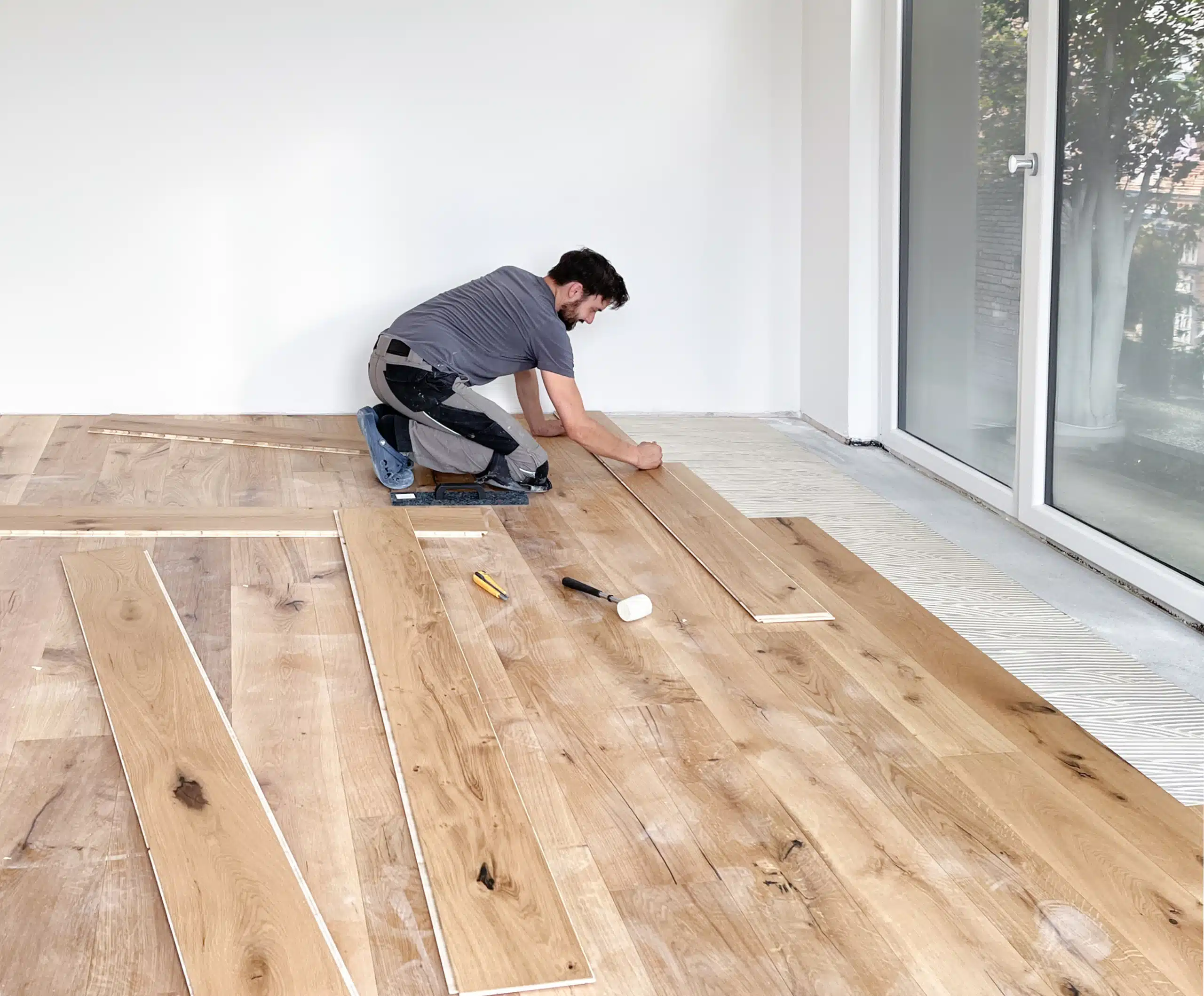Die Verlegung neuer Beläge umfasst Materialen von Parkett und Linoleum bis Kork, Vinyl oder Teppich.