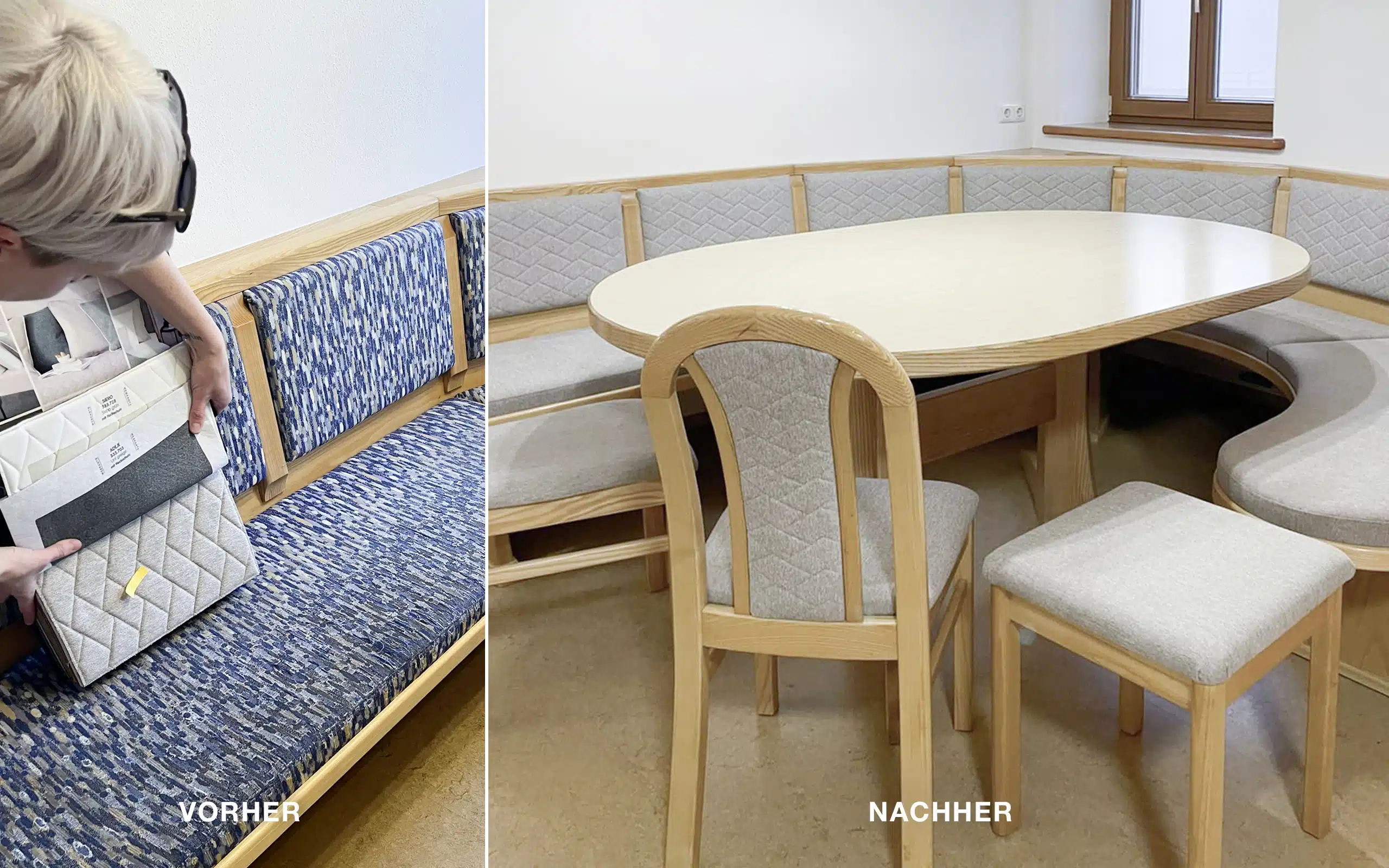 Dabei werden Polstermöbel mit hochwertigen Stoffen und Schaumstoffen neu bezogen und mit neuen passenden Deko-Polstern zu einem stimmigen Gesamtbild ergänzt.