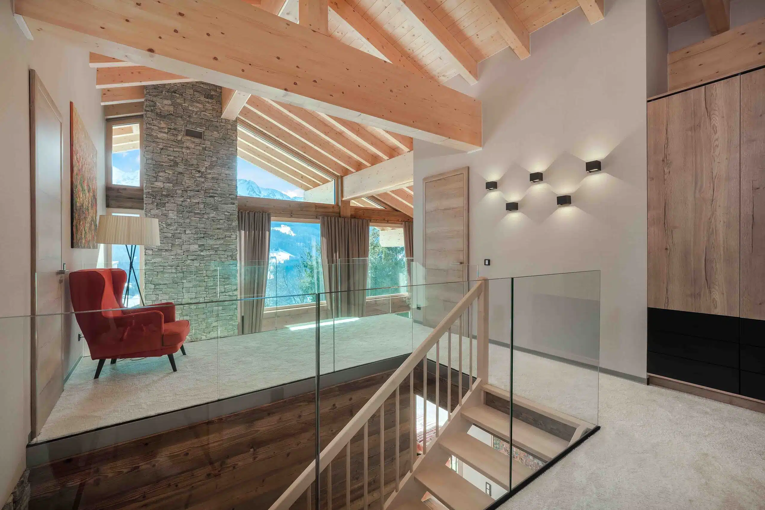 Stoßt man auch damit an die statischen Grenzen, so bietet sich eine Kombination mit Beton in Form einer Holzbetonverbunddecke an oder man verwendet Unterzüge aus Stahl, die nahezu unsichtbar in eine Holzdecke integriert werden können.