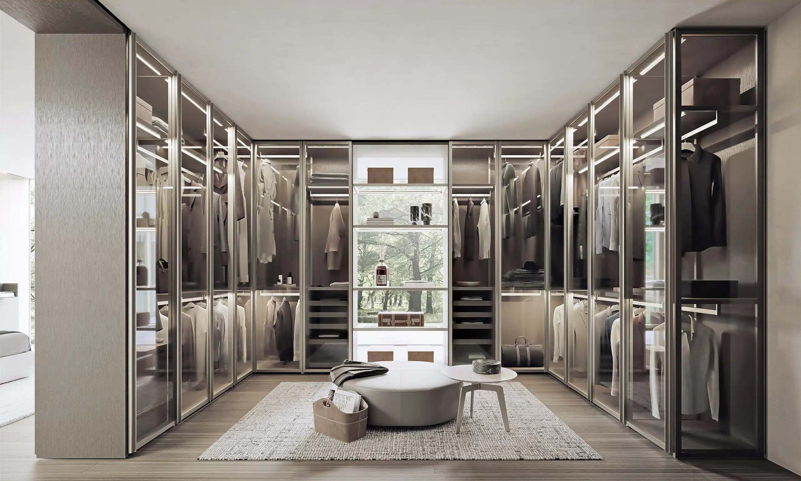 Boxen, Fächer und Laden – vielleicht sogar ein Kleiderlift – strukturieren und schaffen Platz für unterschiedliche Teile. Ausschließlich saisonal benutzte Kleider verschwinden hinter geschlossenen Elementen, während Accessoires und Schmuck in Glasvitrinen vor Staub geschützt sind.