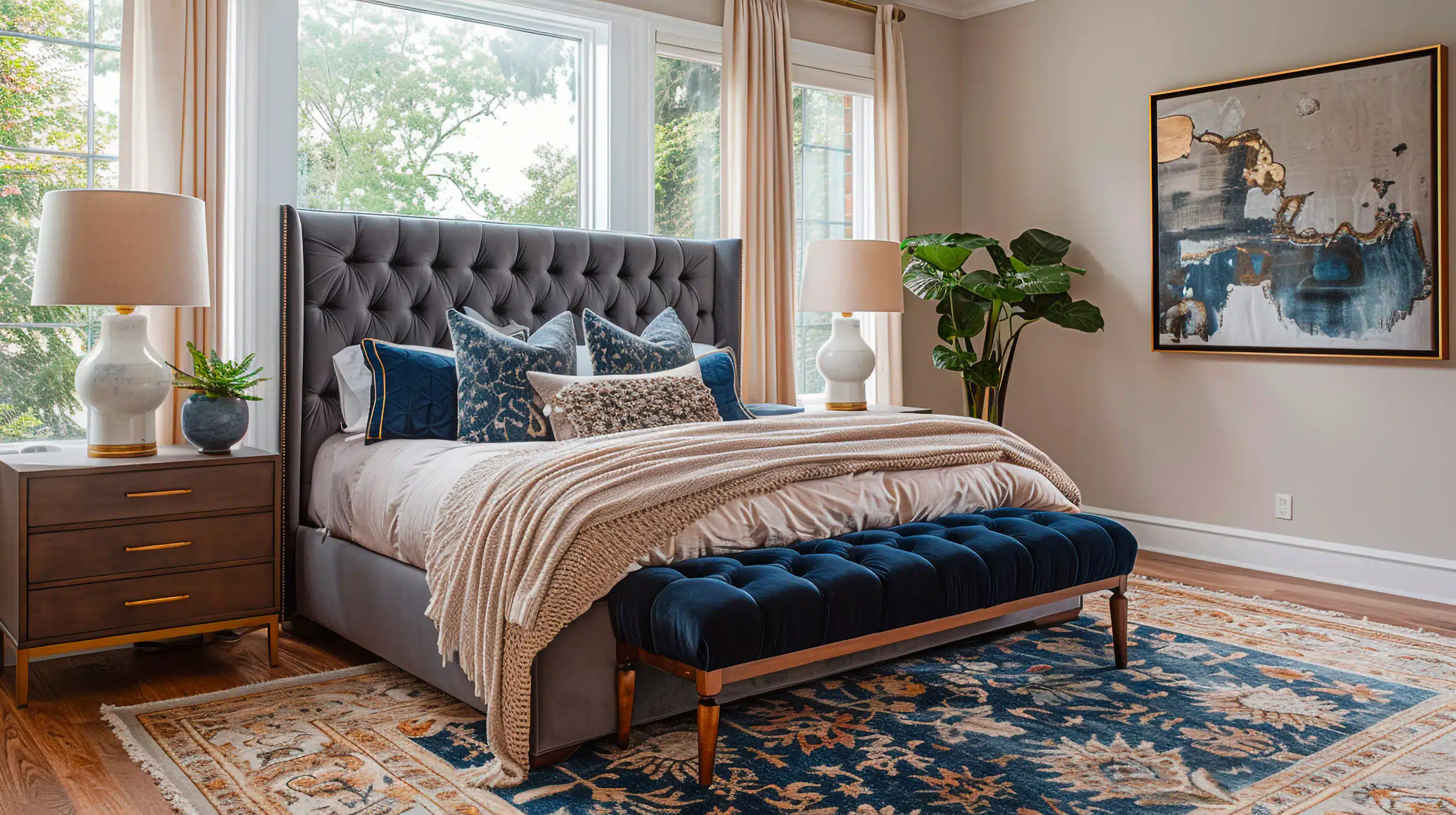 Für den Boden im Schlafzimmer eignen sich leise, elastische, wohngesunde und fußwarme Bodenbeläge wie Designboden, Teppich oder Kork aber auch natürliches Parkett oder hochwertiges Laminat wirken edel. Besonders modern sind Fliesen oder Stein als Bodenbelag im Schlafzimmer.