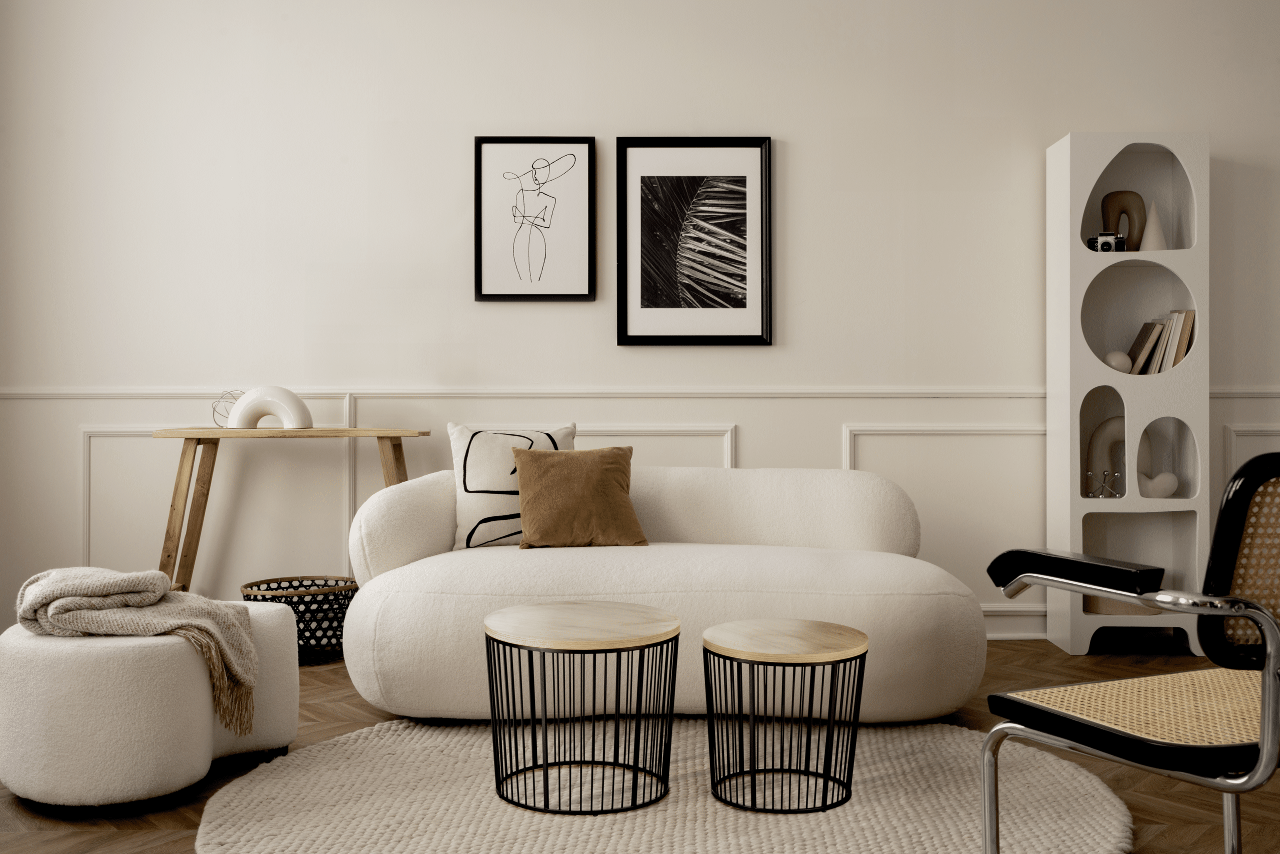 Bei der Gestaltung eines modernen Wohnzimmers stehen ästhetische Möbel mit klaren Linien und funktionalem Design im Mittelpunkt. Ich kann eine harmonische Raumatmosphäre erzeugen, indem ich diese Möbelstücke mit dezenter und schlichter Dekoration und großzügig gestalteten Freiflächen an Boden und Wänden kombiniere.