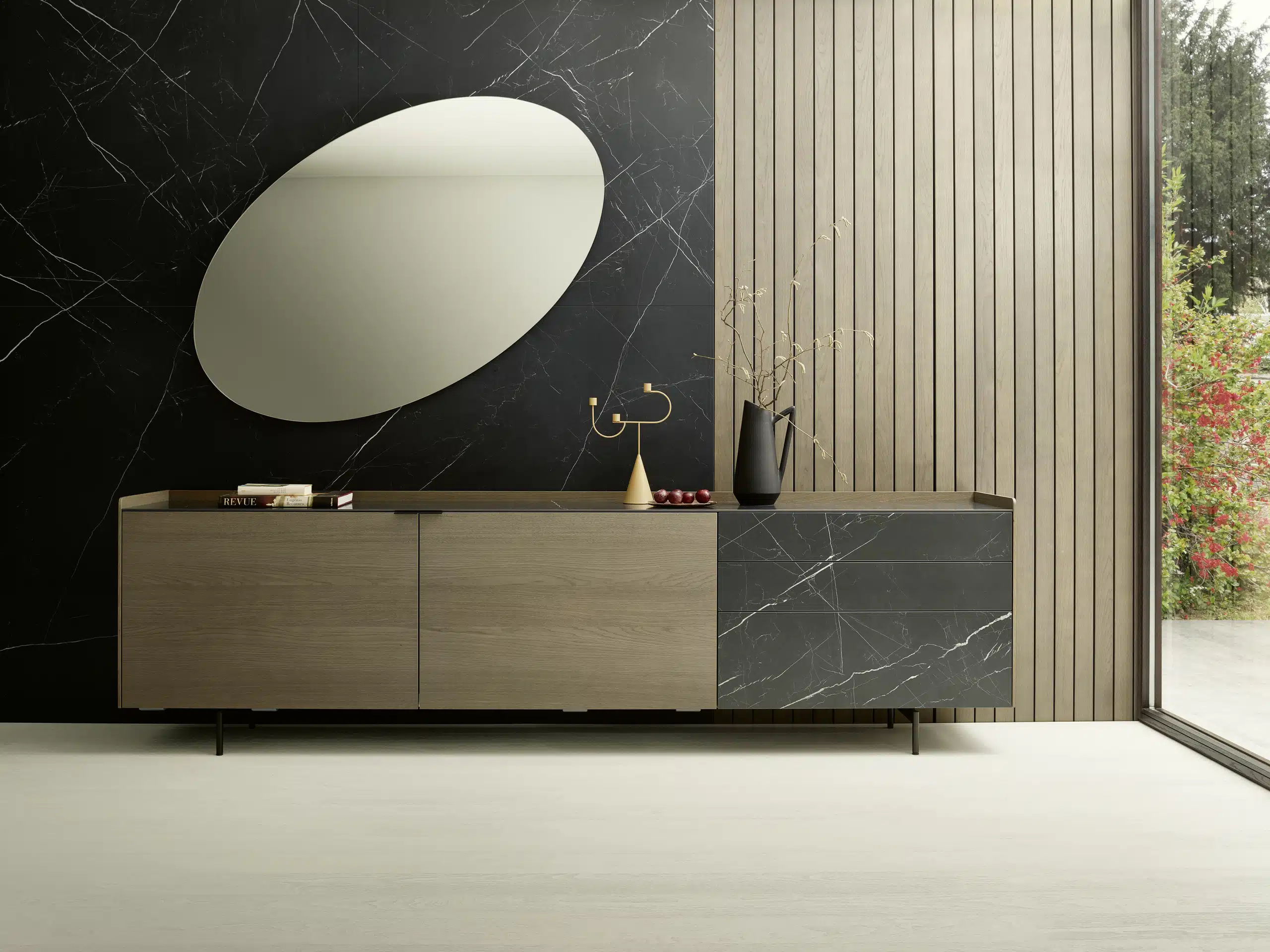 Bei der Materialwahl gefragt ist Holz – meist in massiver Ausführung, etwa aus Räuchereiche oder Spessarteiche, oft auch geölt. Kontrastiert wird Holz gerne mit Uni-Lack-Elementen, hochglänzend oder matt.