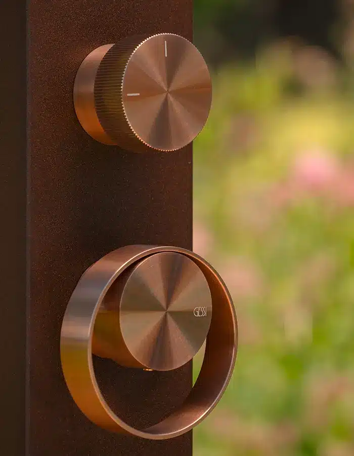 Die ästhetische Qualität von Gessi zeigt sich in hochwertigen Materialien und Oberflächen mit starker visueller Wirkung. Der verwendete Stahl, ausgewählt wegen seiner Widerstandsfähigkeit, wird mit innovativen Technologien wie dem PVD-Verfahren behandelt ein modernes Verfahren, das dem Metall Farbe verleiht und gleichzeitig glänzende, gleichmäßige und langlebige Oberflächen schafft. Oberflächen wie Matt-Schwarz, das Spiegelungen anderer Farben vermeidet, oder Corten, das durch manuelle Verarbeitung entsteht, verleihen den Elementen Charakter und betonen ihre Volumina. Das Spiel mit Material- und Farbkontrasten macht jedes Detail zu einem stilistischen Statement. Das Ergebnis ist ein reduziertes, aber ausdrucksstarkes Design, das exklusive und persönliche Outdoor-Räume schafft.