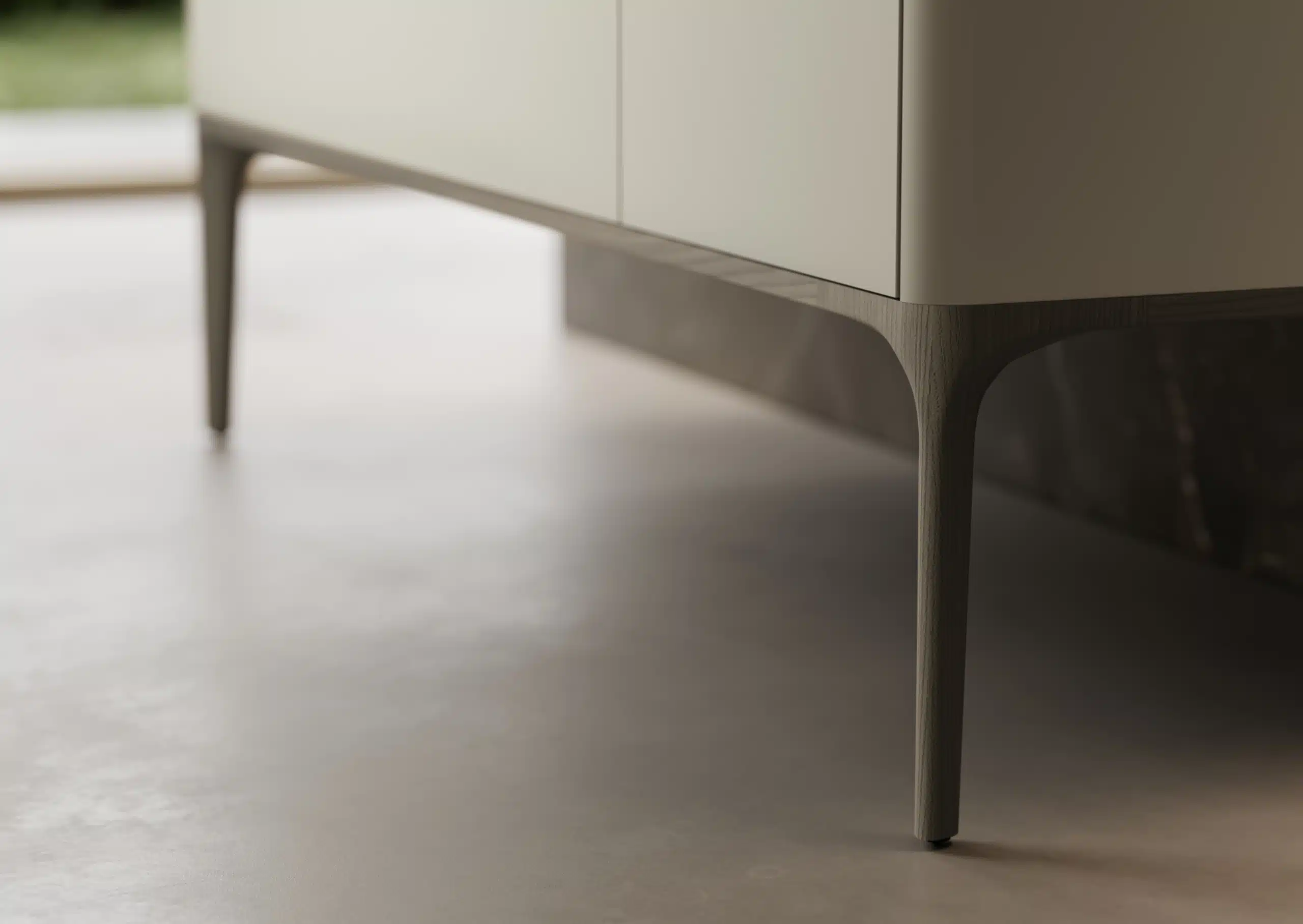 Die Abschluss-Seitenwand Raggio 26 kann mit dem Untergestell Seventy kombiniert werden, einem Holzgestell mit nur zwei Füßen an der Vorderseite, das in Noce Canaletto und in allen Ausführungen des Modells erhältlich ist.