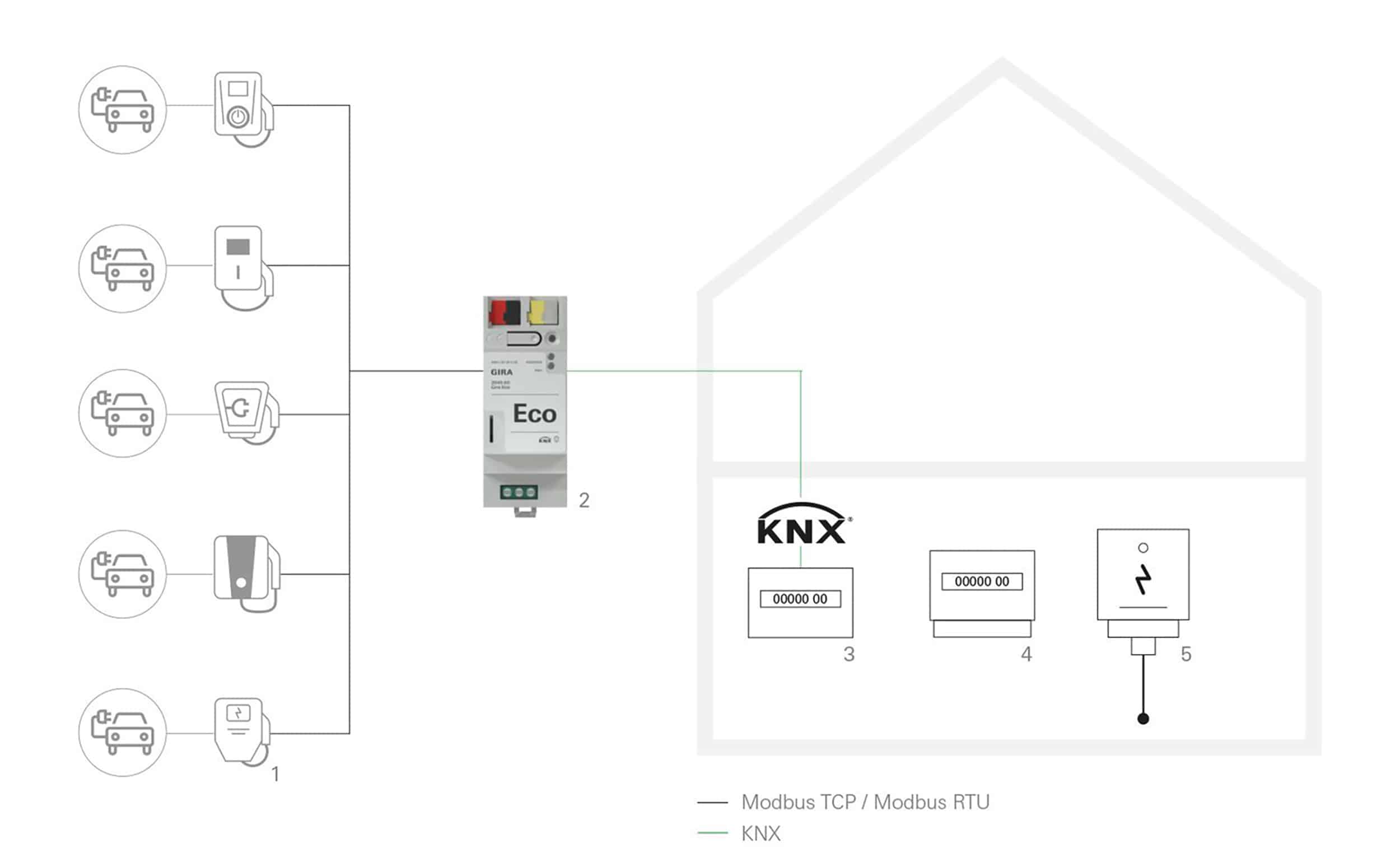Der Gira Eco ermöglicht die Einbindung von bis zu fünf Wallboxen unterschiedlicher Hersteller ins KNX System. Das ist praktisch auch für Mehrfamilienhäuser. Bereits viele Hersteller sind kompatibel – und weitere werden folgen.