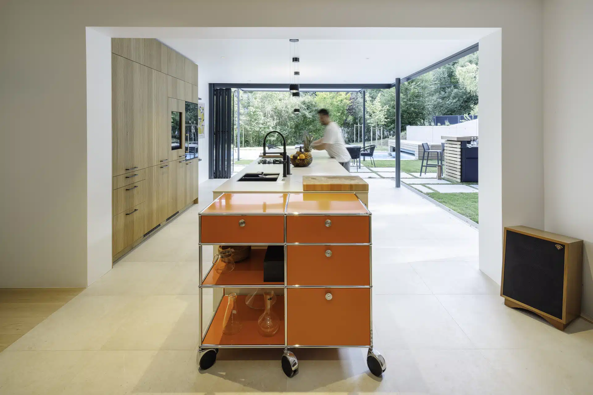 Auch im geschlossenen Zustand bleibt das Wohnerlebnis flexibel: Eine integrierte Drehtür, die sich um 180 Grad öffnen lässt, dient als komfortabler Zugang zur Terrasse.