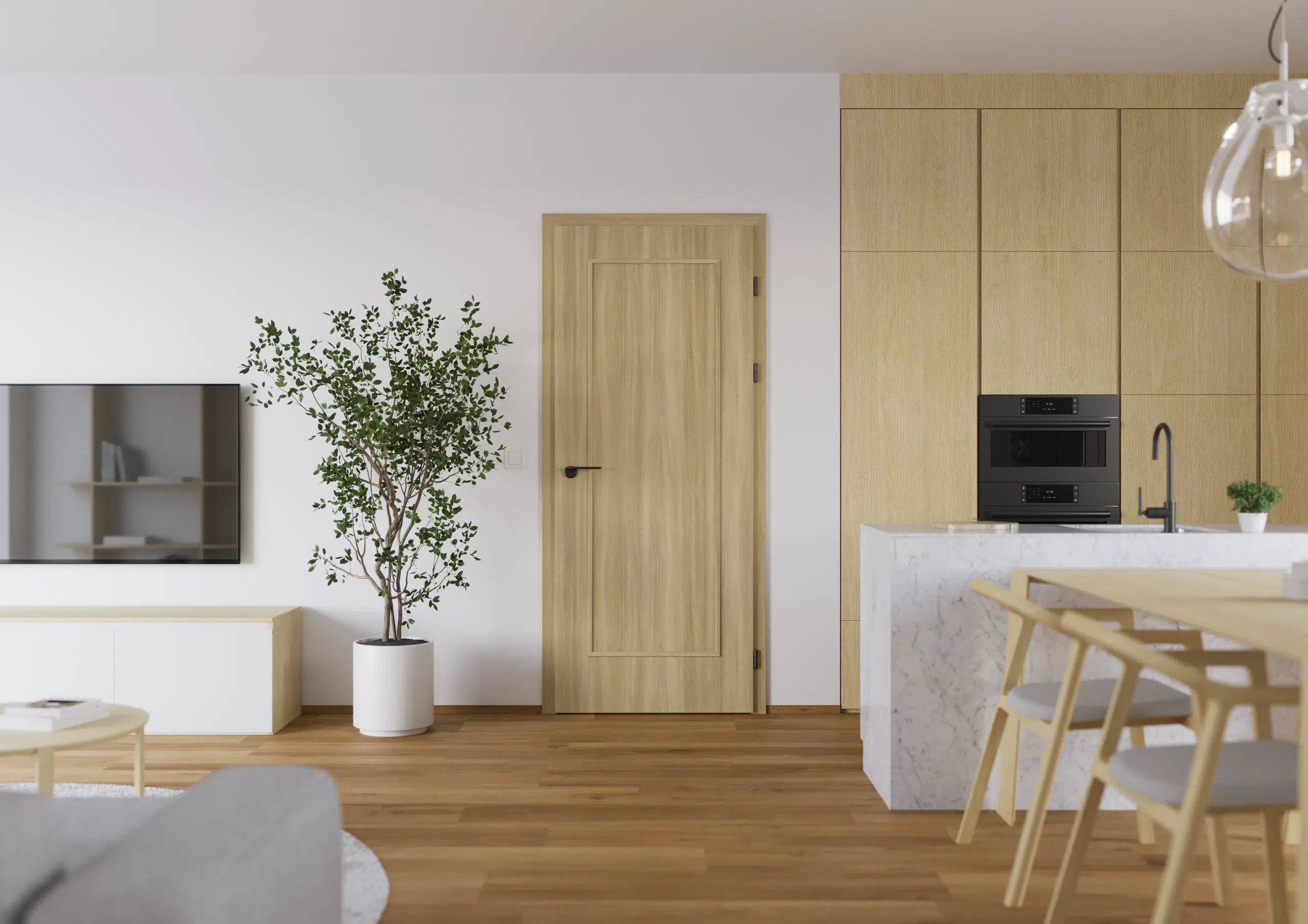 Eine helle Oberfläche mit feiner, tief wirkender Holzmaserung verleiht der Tür eine lebendige Struktur, ohne aufdringlich zu wirken.