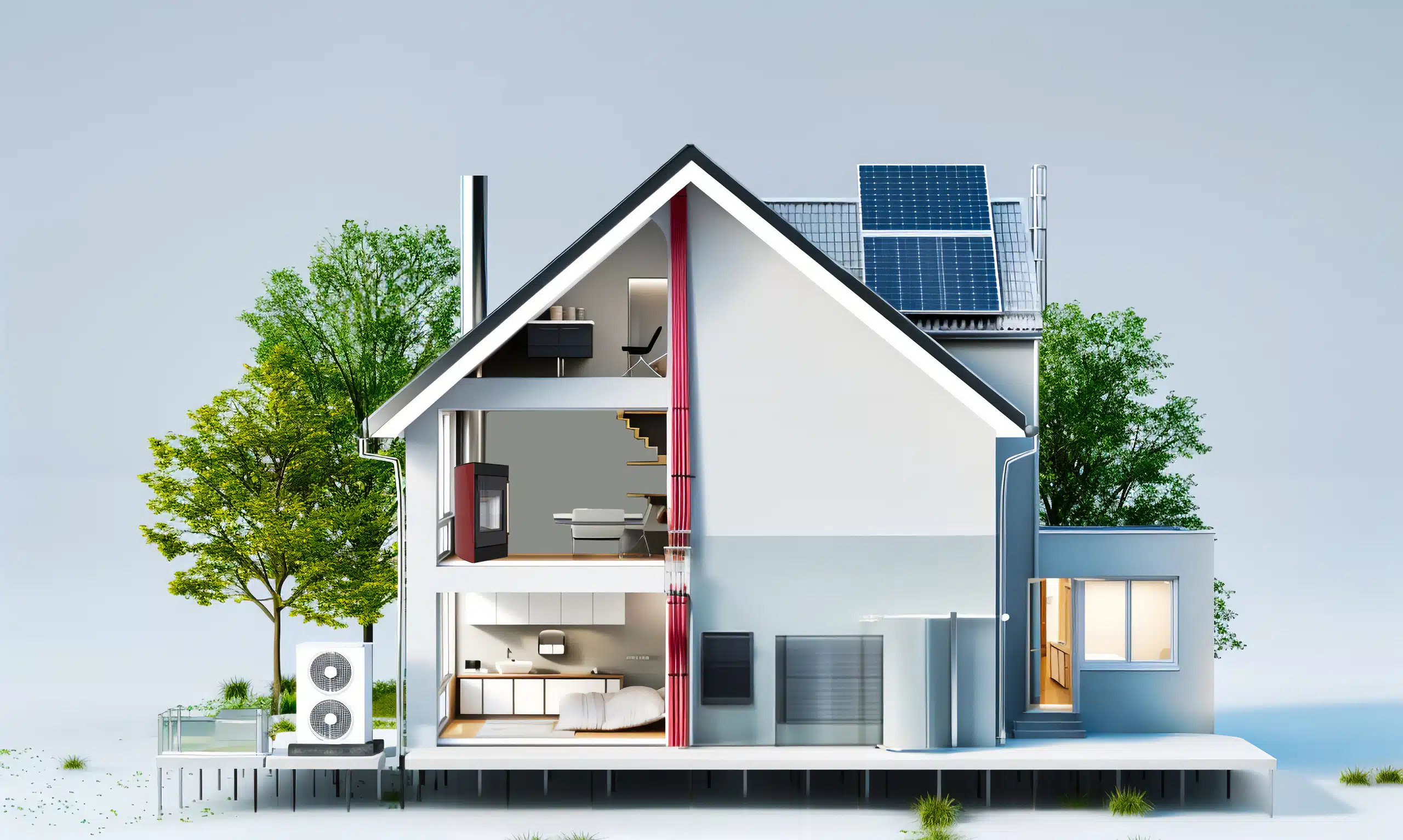 Moderne Häuser zeichnen sich durch geringen Energieverlust sowie das Streben nach Autarkie aus. Politisch wird zunehmend von fossilen Brennstoffen wie Öl und Gas Abstand genommen. Stattdessen kommen – oft gefördert durch Land und Bund – Zentralheizungen mit Pellets, Fern- oder Nahwärme sowie Wärmepumpen zum Einsatz. Diese übernehmen meist auch die Warmwasserbereitung. Abhängig von der Haushaltsgröße werden dafür Pufferspeicher mit 500 bis 1.000 Litern Volumen genutzt, die unter anderem die Fußbodenheizung versorgen. Bereits in der Planungsphase sollte der Anschluss eines wassergeführten Kaminofens bedacht werden, der neben Effizienz auch Gemütlichkeit und zusätzliche Versorgungssicherheit bietet.