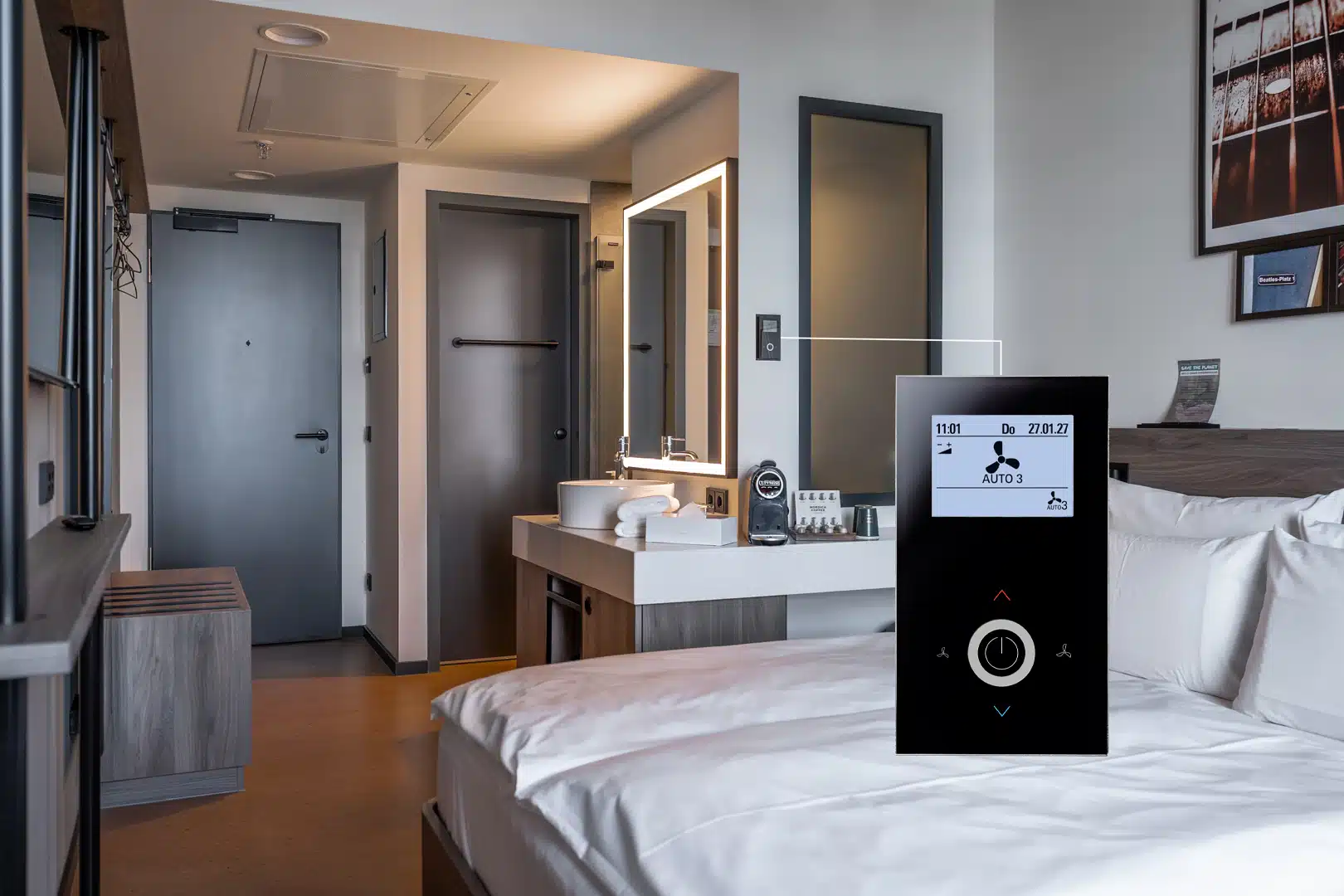 Bei der Entwicklung eines Konzepts für die Klimaregelung in den Zimmern hatten Energieeffizienz und Nachhaltigkeit höchsten Stellenwert. Aufgabenstellung für den beauftragten Systemintegrator, die VM-Technik GmbH, war es zudem, ein Raumbediengerät zur Einbindung in die Gebäudeautomation zu finden, das auch dem Designgedanken der Innenarchitektur und dem Komfortbedürfnis der Gäste gerecht wird.