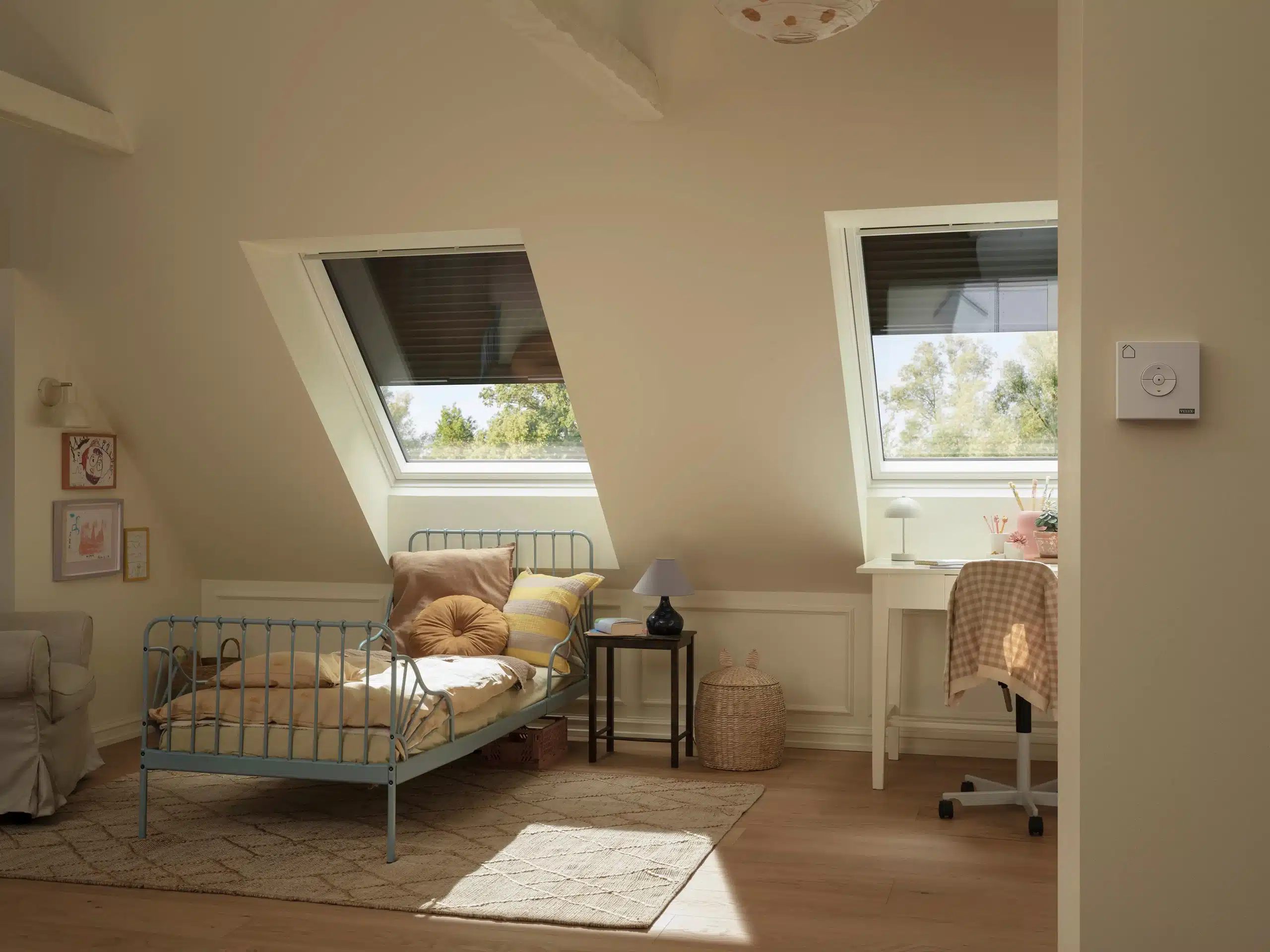 Für Neubauten mit Elektrofenstern empfiehlt sich der elektrische Rollladen, bei Renovierungen oder Nachrüstungen die solarbetriebene Version – kabellos, energieautark und einfach zu montieren. Mit der „VELUX App Control“ oder „VELUX Active“ lassen sich die Rollläden auch bequem per Smartphone oder Sprachbefehl steuern oder automatisch regeln – abhängig von Raumtemperatur und Wetterdaten.