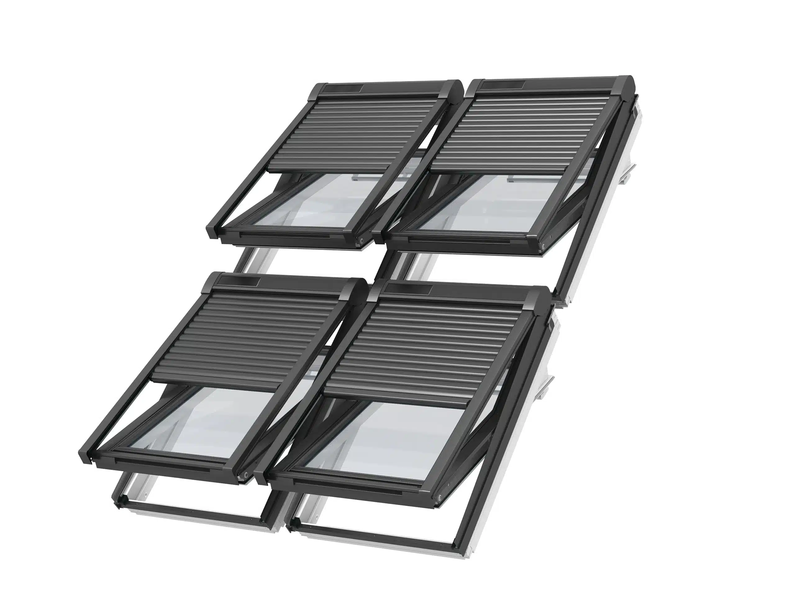 Da das Fenster unabhängig bedienbar bleibt, lassen sich die neuen Rollläden mit einer Vielzahl von Lichtlösungen kombinieren – bereits ab 1,8 cm Fensterabstand nebeneinander bzw. 10 cm übereinander. Damit eröffnen sich noch mehr Möglichkeiten für harmonische, funktional durchdachte Dachfensterlösungen. Neben der Ausführung in Dunkelgrau sind auch individuelle Lackierungen in nahezu alle gängigen RAL-Farben möglich.