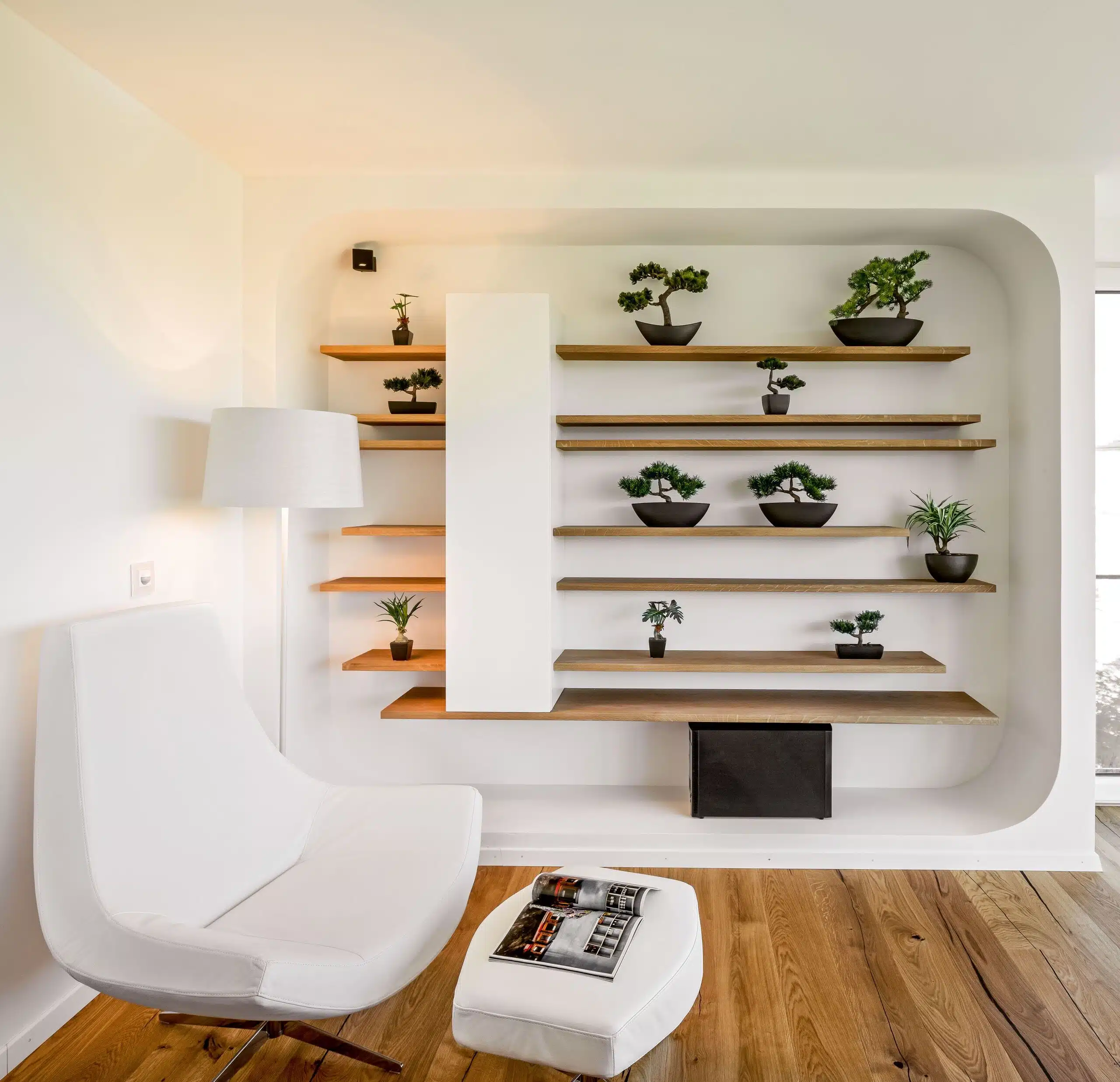 Organische Formen und Transparenz bestimmen das Ambienti+ Musterhaus in Seebruck. Eine freischwebende Treppe führt in den Rückzugsort der Familie.